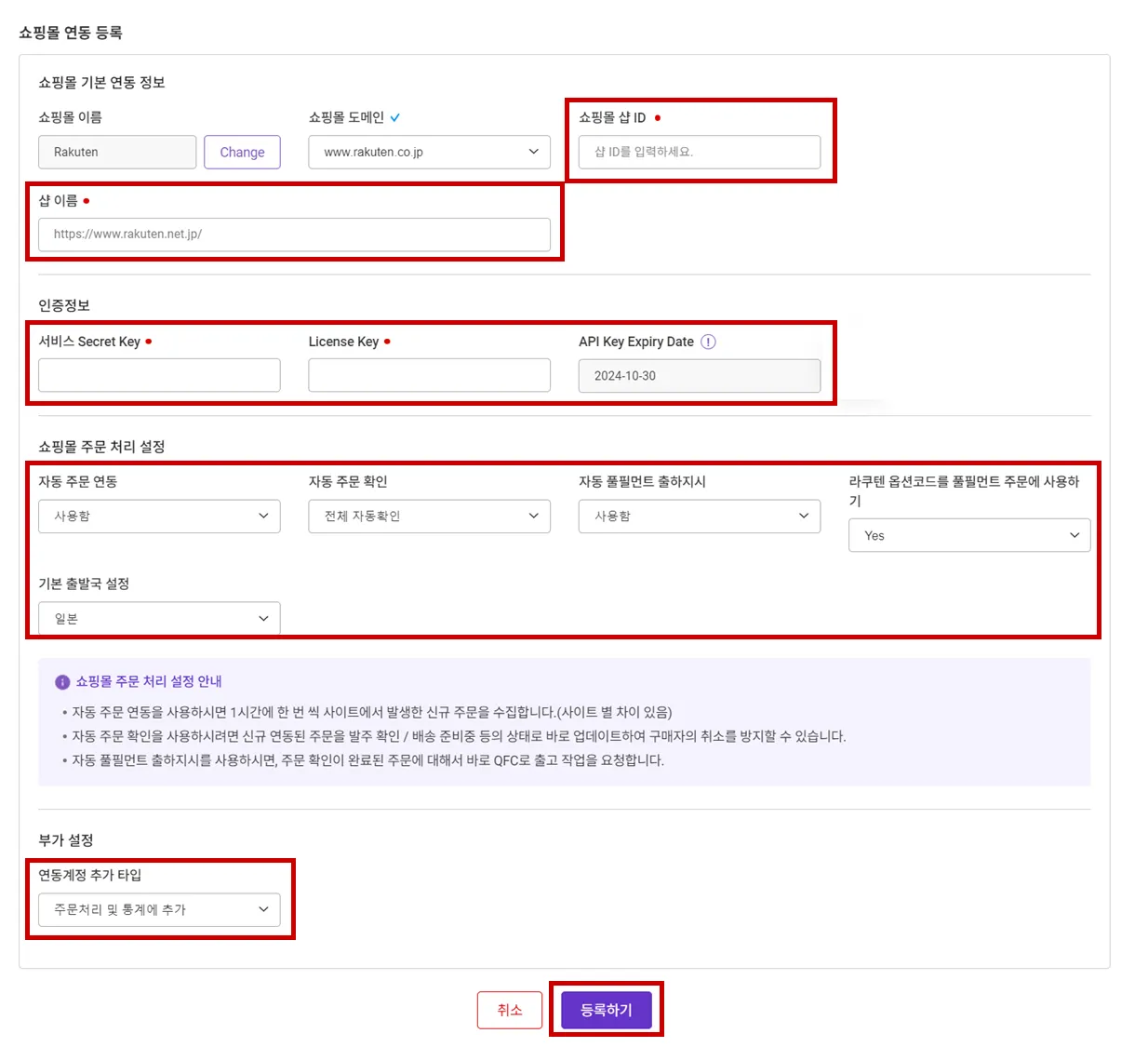API 연동 설정에 필요한 정보들을 입력하고 등록해주세요.