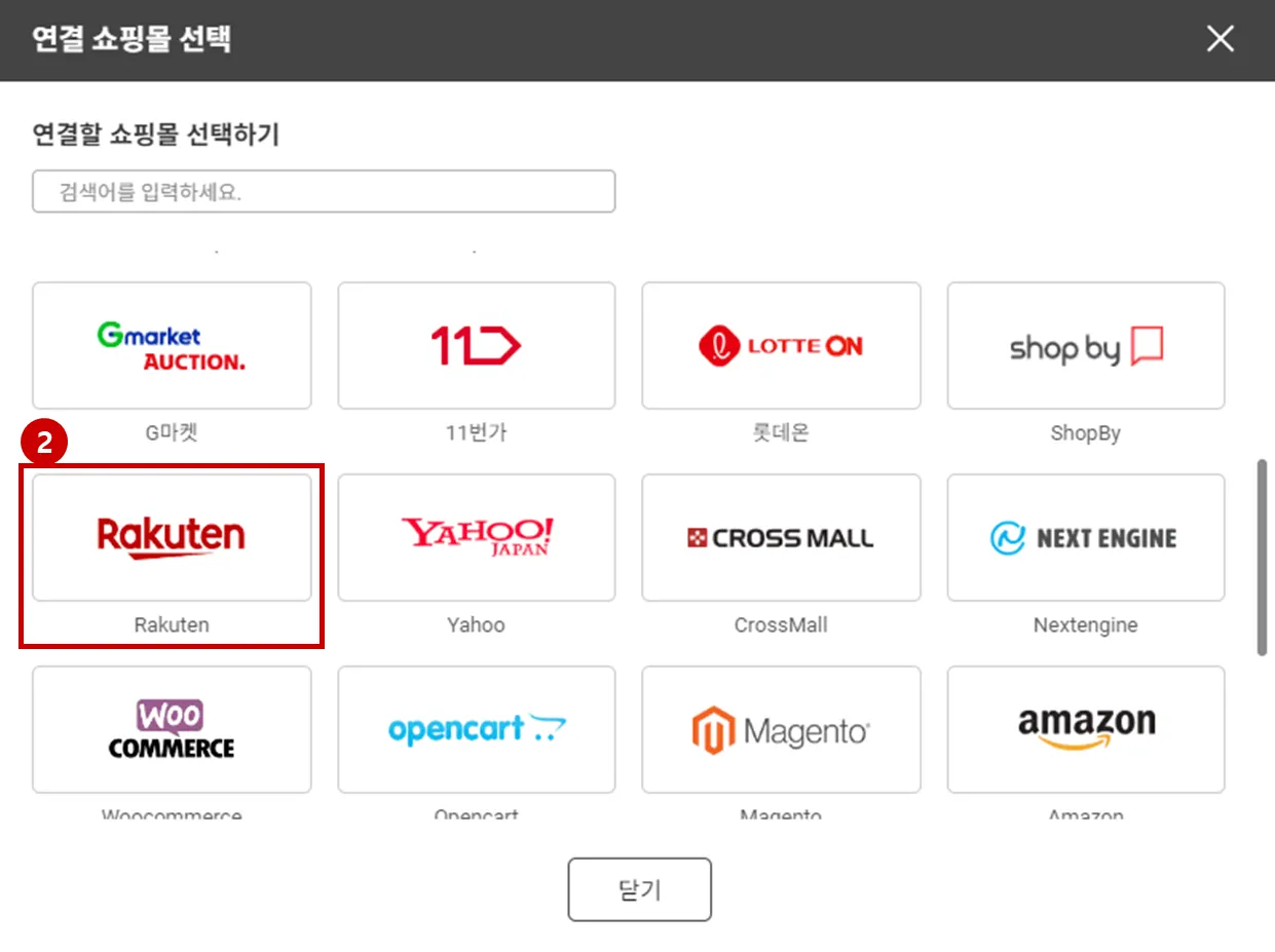 “Rakuten”을 선택한 후, 하단의 "쇼핑몰 연동 등록"으로 스크롤을 이동해주세요.
