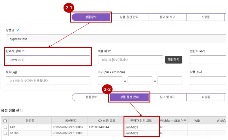 ‘옵션관리’ 탭에서 ‘판매자 정의 코드’ 를 입력해주세요.