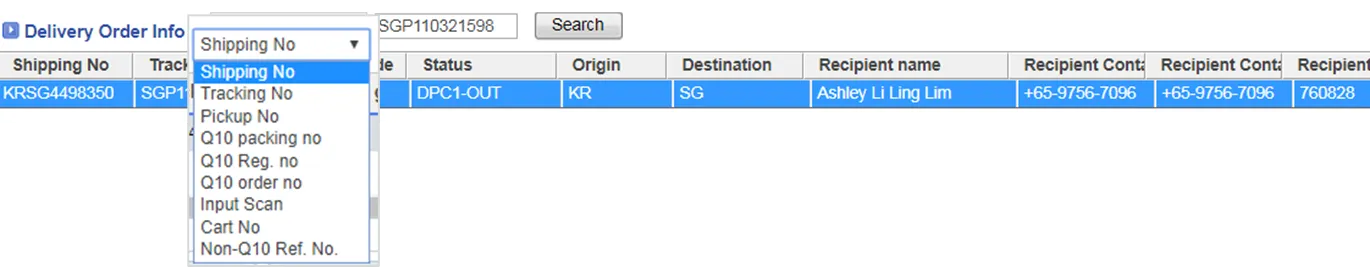 싱가폴향 화물은 packing no.와 tracking number 가 일치 함 | SGP67968949(SG향)
