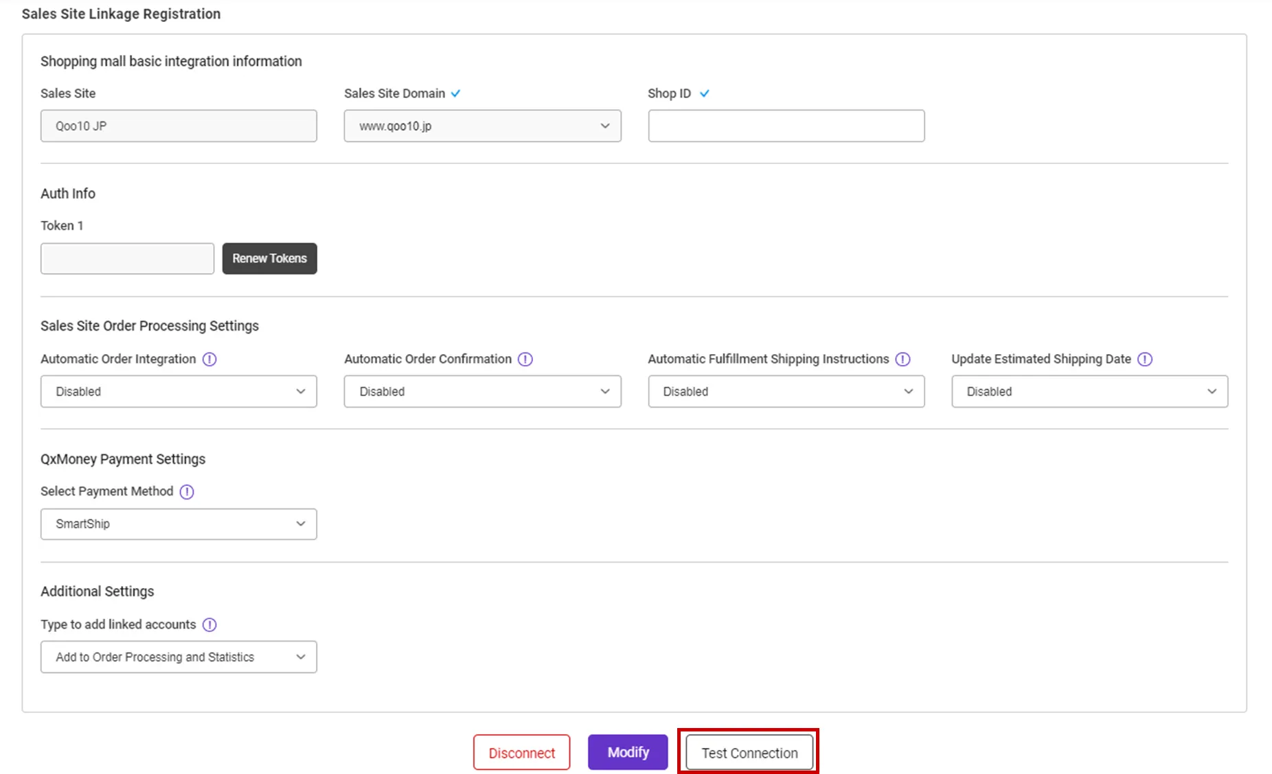 After registration the API with Ebay Japan(Qoo10 JP), you can test connection to verify.