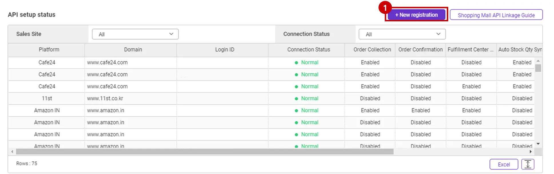 After entering the Sales Site API settings page, Click the "New registration" button at the top.