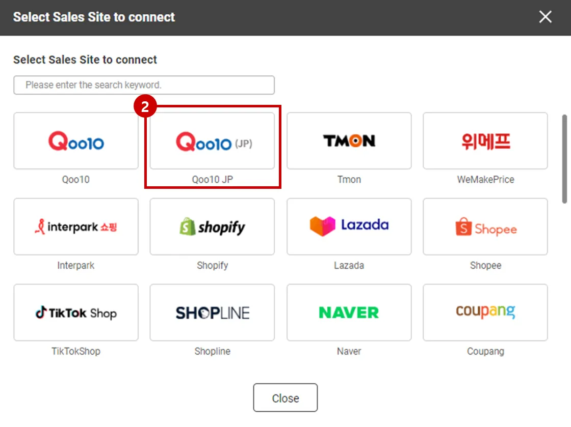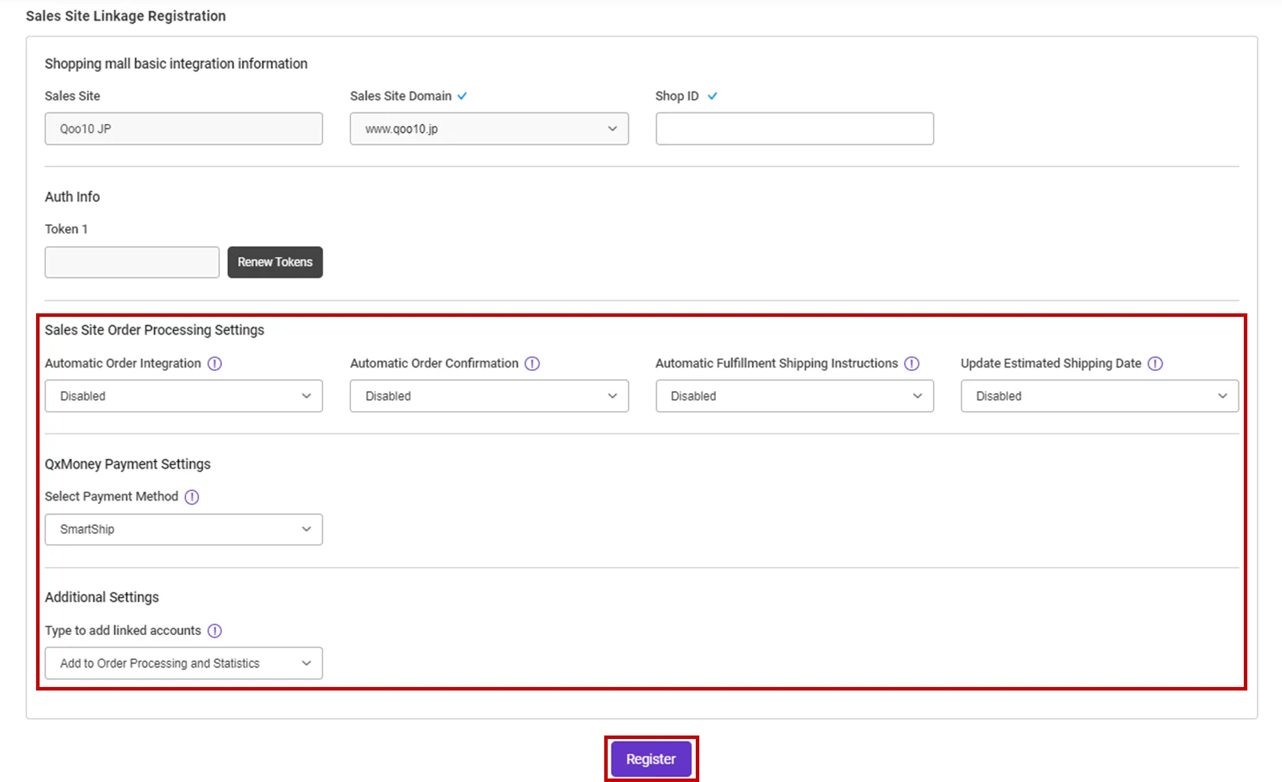 Select "Qoo10(JP)" Logo and please scroll to the "Sales Site Linkage Registration".