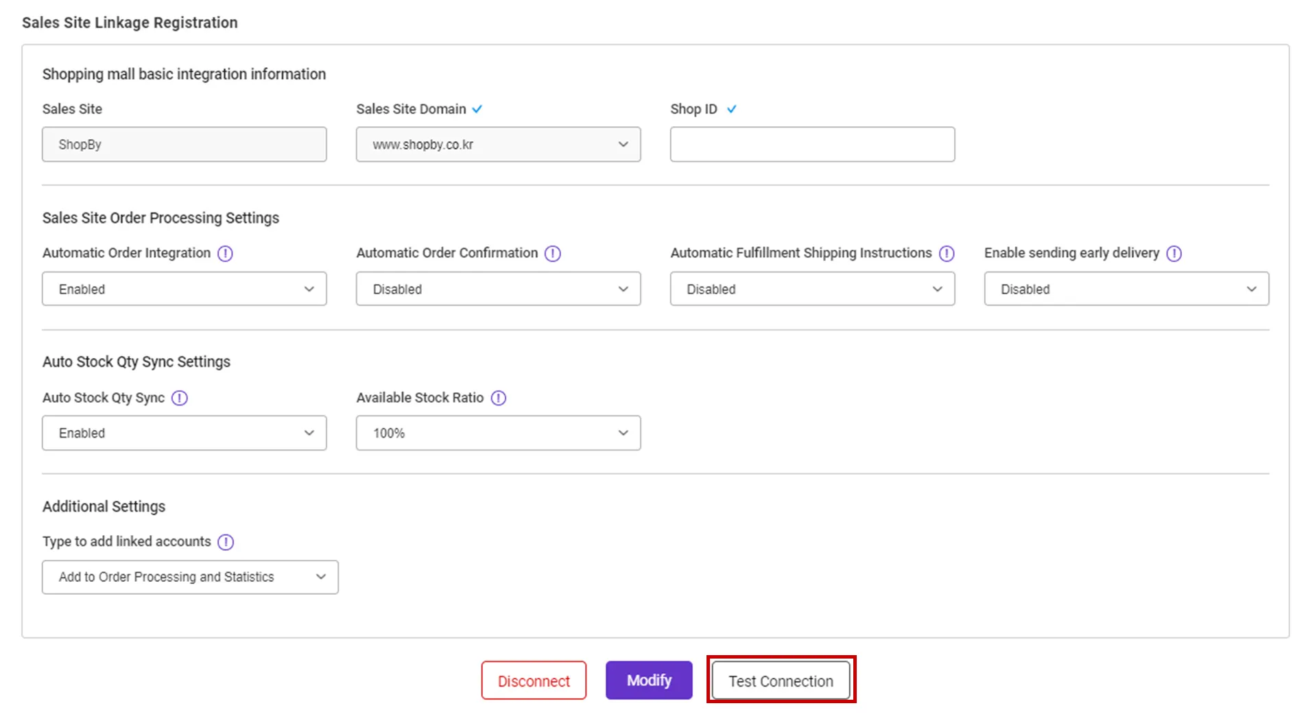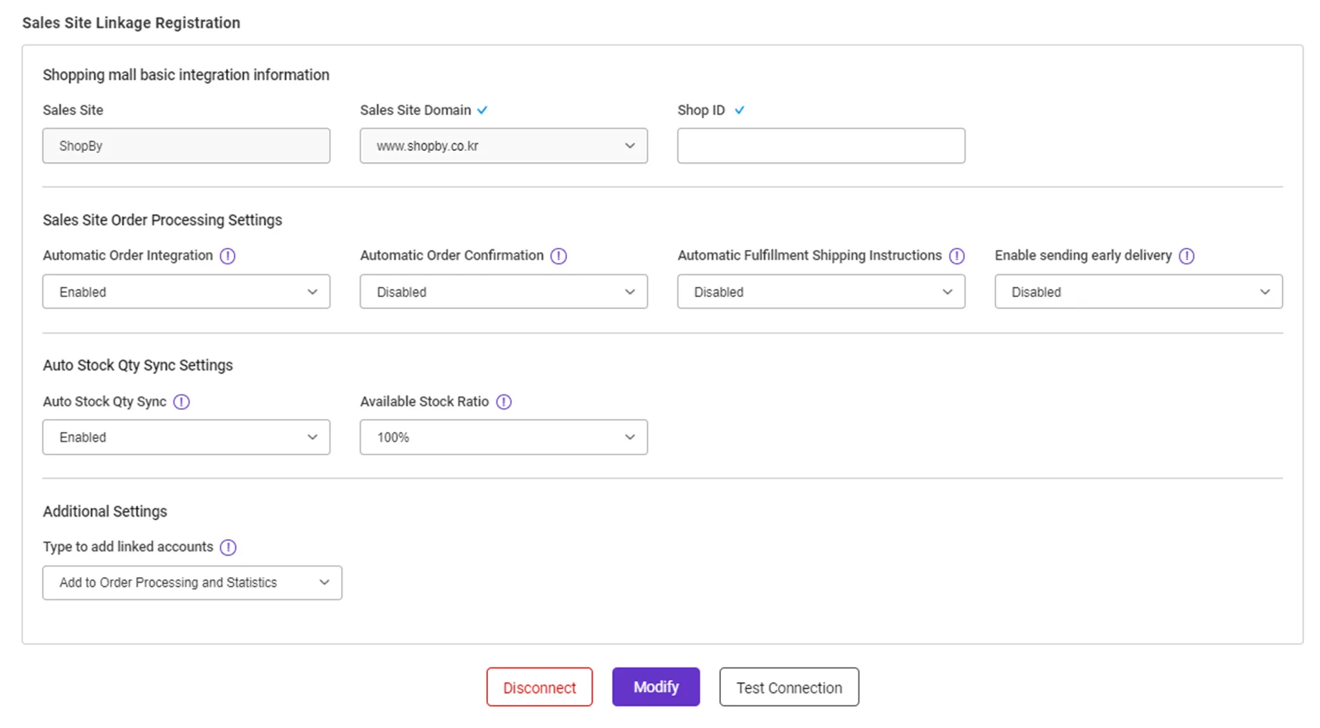 After installing the Smartship app from Shopby App Store and completing the linking, you will see that Shopby has been added to your shopping mall linked account. For information on order processing options, please check ‘API Connection Setting Options’ below.
