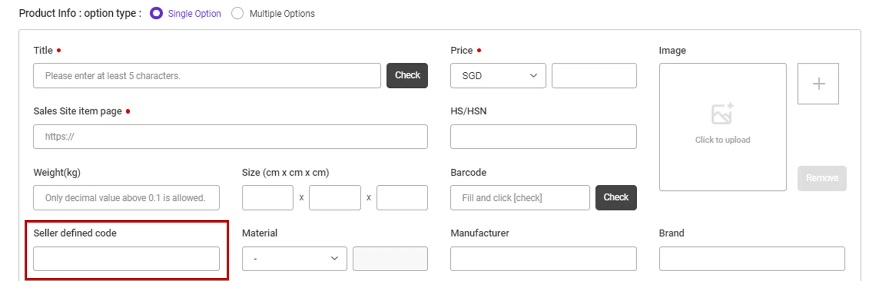 Register a SKU of a single option type, and enter a 'Seller defined code'.