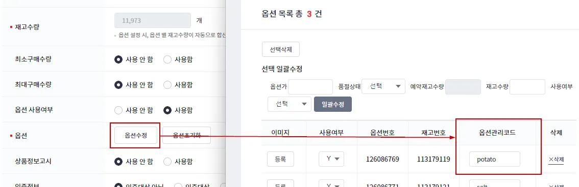 Path : Shopby > Item List or Item Registration > Click the [옵션수정] button under Options > Enter [옵션관리코드] in a new window