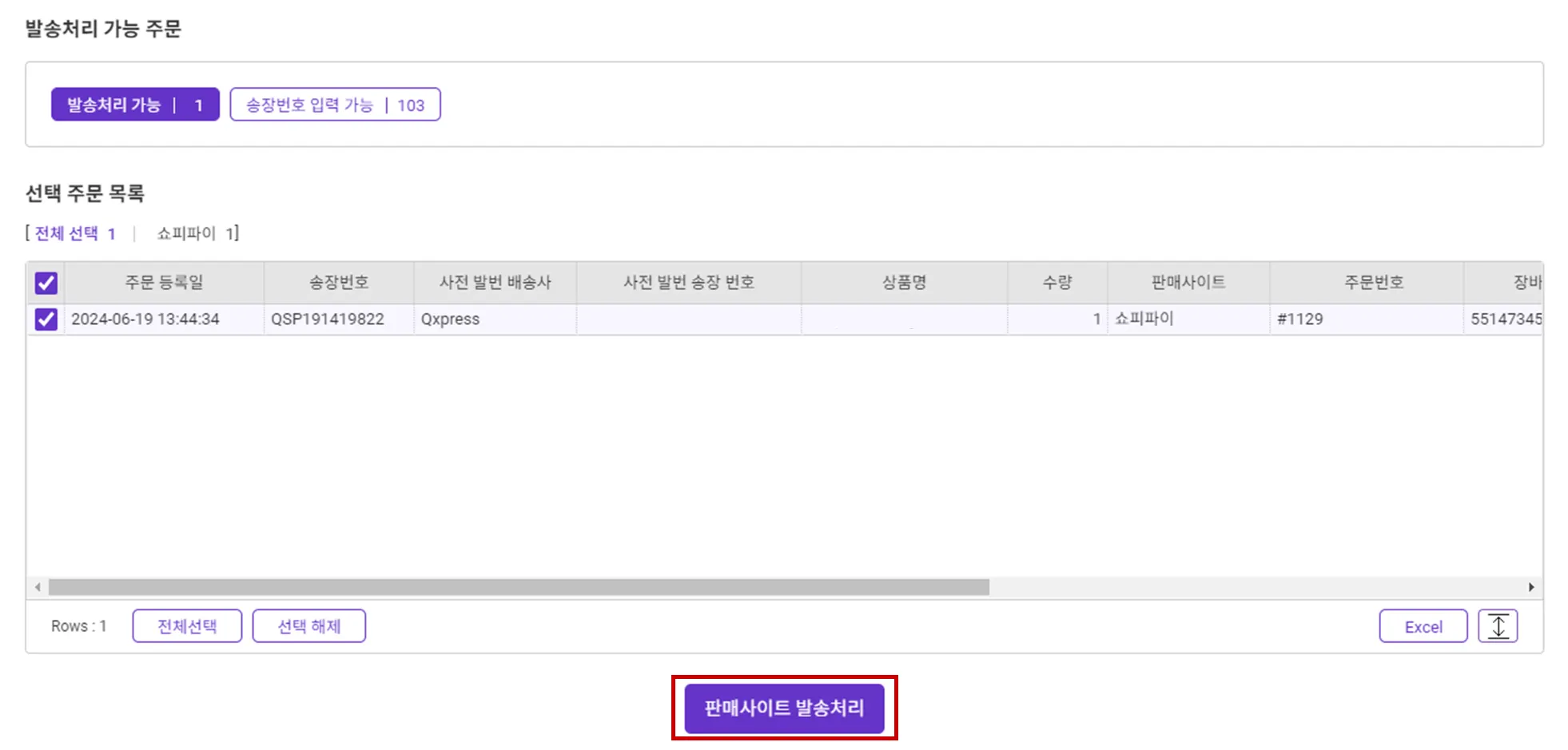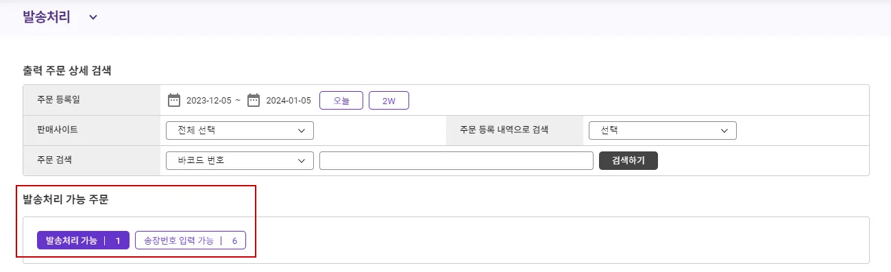 발송처리 가능 : 스마트십에서 송장은 생성하였지만 발송처리 하지 않은 주문