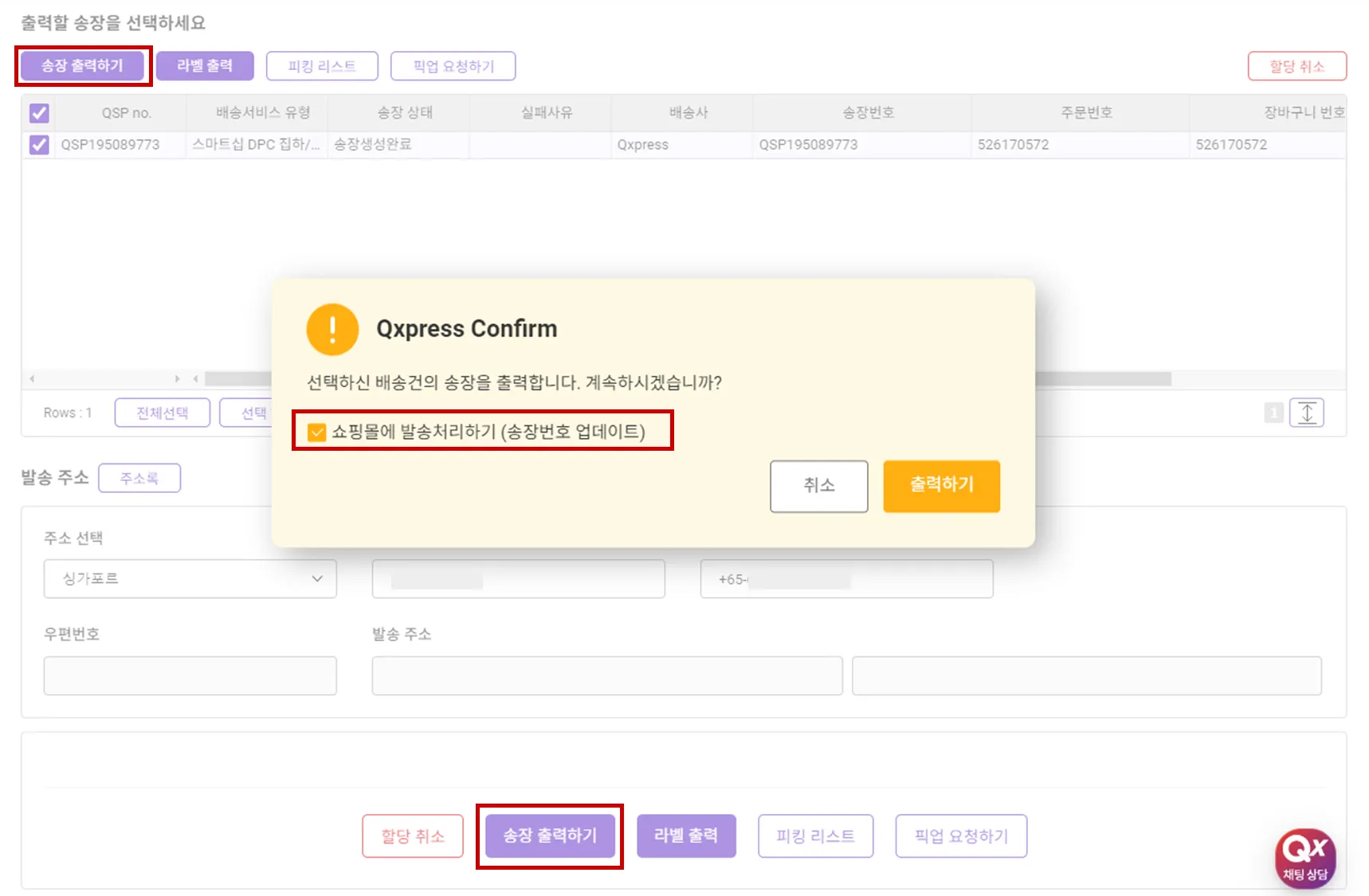 버튼을 눌러 확인을 하는 시점에 쇼핑몰로 발송처리를 호출하여 배송 상태 및 송장번호를 업데이트합니다.
