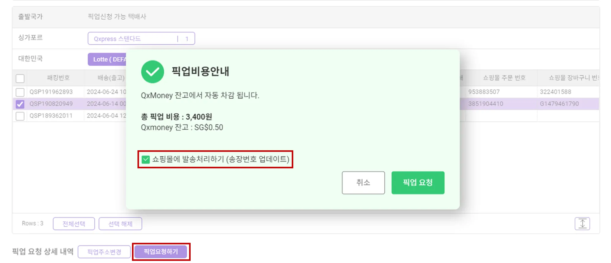 한국 또는 싱가포르 및 인도에서 출발하신다면, 판매자님은 큐익스프레스로 픽업을 요청하실 수 있습니다. 픽업을 요청하는 시점에 판매사이트의 주문 상태를 업데이트 하실 수 있습니다.