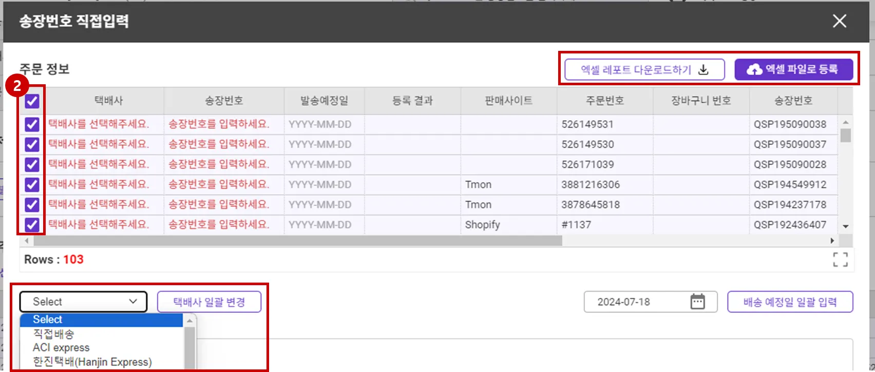 주문별 발번된 택배사 및 송장번호를 직접 입력하실 수 있습니다.