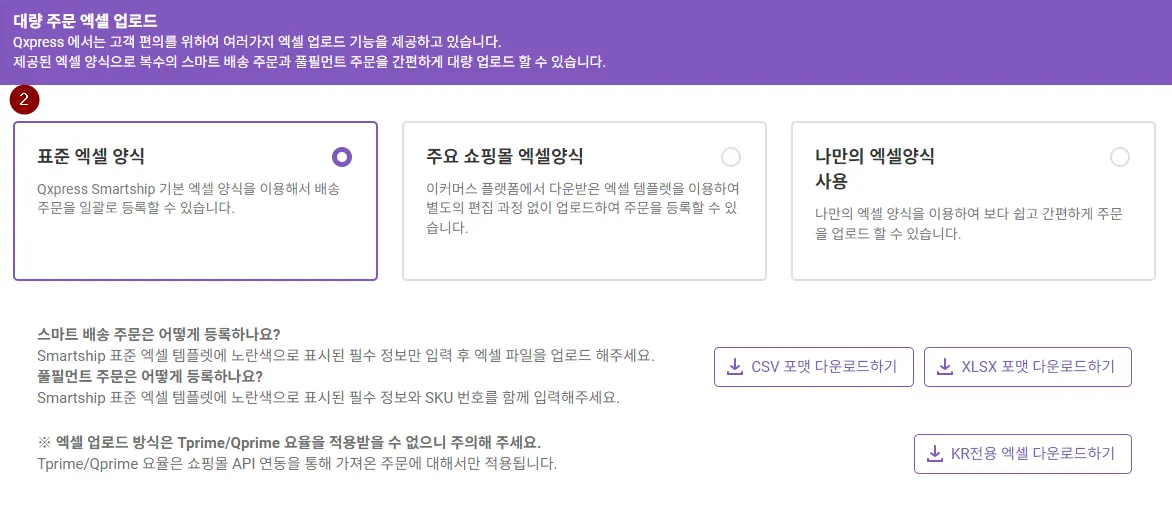이어 나타나는 팝업창에서 이용하실 엑셀 양식 타입을 선택해주세요. 스마트십에서 제공하는 업로드 가능한 템플렛은 아래와 같습니다.