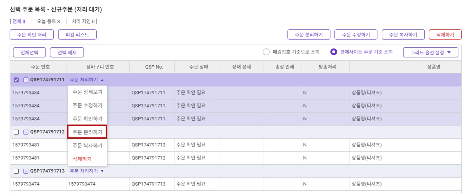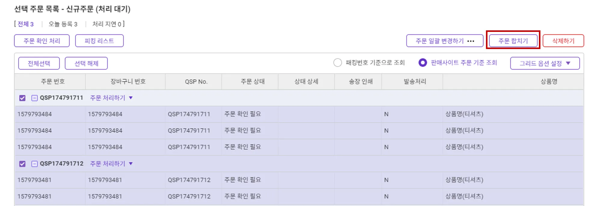 수동으로 주문 합치기를 실행한 경우, 신규 배송번호(QSP no.)가 생성됩니다.