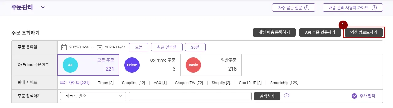 주문관리 우측 상단의 [ 엑셀 업로드하기 ] 버튼을 눌러주세요.