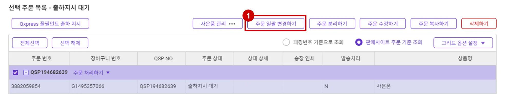 주문관리 메뉴의 주문 목록에서 운송 수단을 지정하고 싶으신 주문을 선택 후, [주문 일괄 변경하기] 버튼을 눌러주세요.