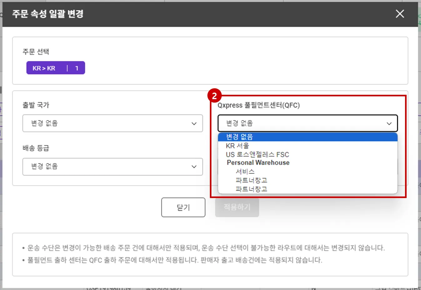 이어 나타나는 팝업창에서 작업을 지시할 센터를 선택하신 후, [적용하기] 버튼을 눌러주세요.