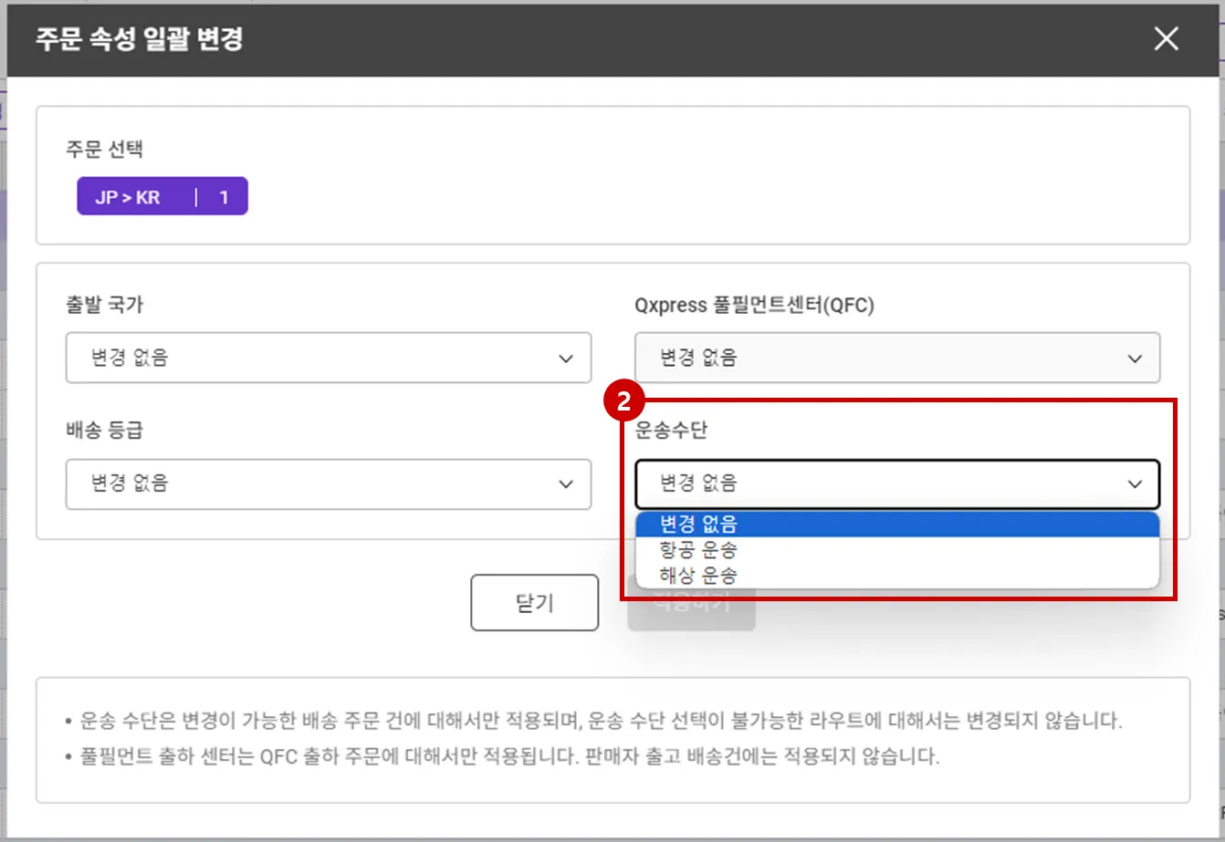 이어 나타나는 팝업창에서 운송 수단을 지정하신 뒤, [적용하기] 버튼을 눌러주시면 완료됩니다.