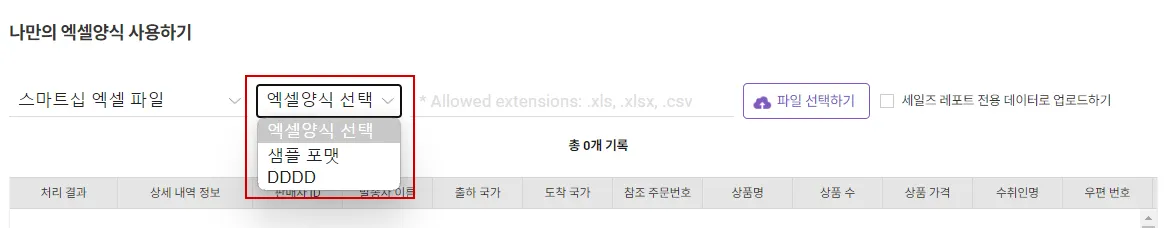 어떤 엑셀 양식을 선택할 것인지 먼저 선택하신 뒤 파일을 업로드 해주세요.