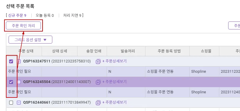 신규주문(처리대기) 상태의 주문을 조회하시고, 확인하실 주문을 선택해주세요.