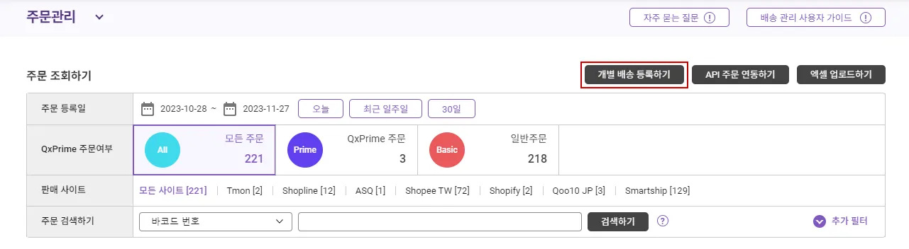 주문관리 우측 상단의 [개별 배송 등록하기] 버튼을 눌러주세요.