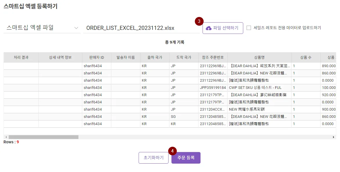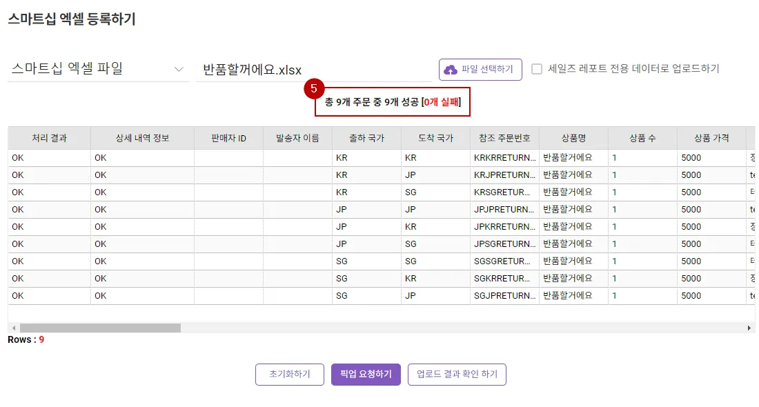 주문 등록이 완료되면 결과를 확인 후, 실패한 주문이 있는 경우, 수정하여 다시 등록해주셔야 합니다. 실패 사유에 대해서는 “상세 내역 정보” 열을 확인해주세요.