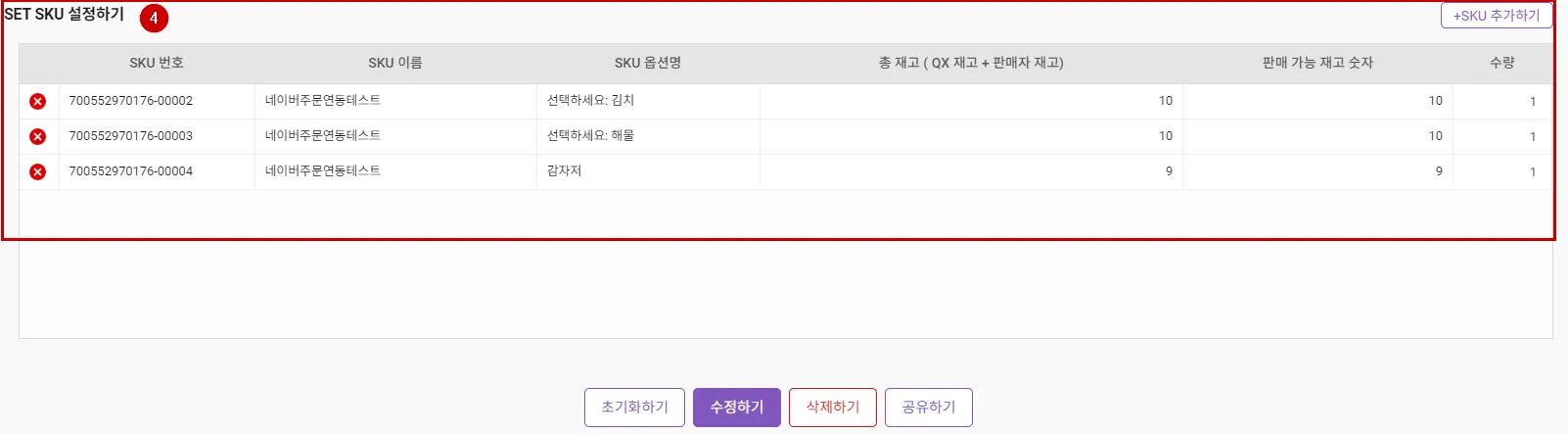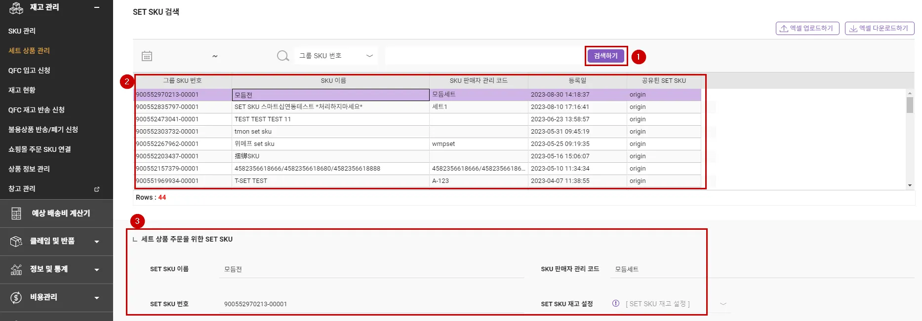 등록한 SET SKU 목록이 나타나며, 클릭 시 상세 내용이 하단에 표시됩니다.