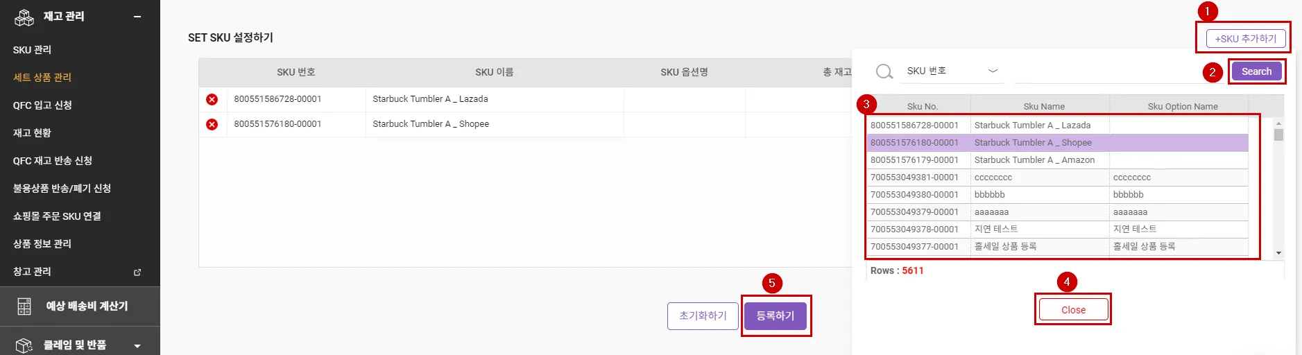 [Search] 버튼을 클릭하여 SET SKU로 묶을 SKU 리스트를 불러오세요.