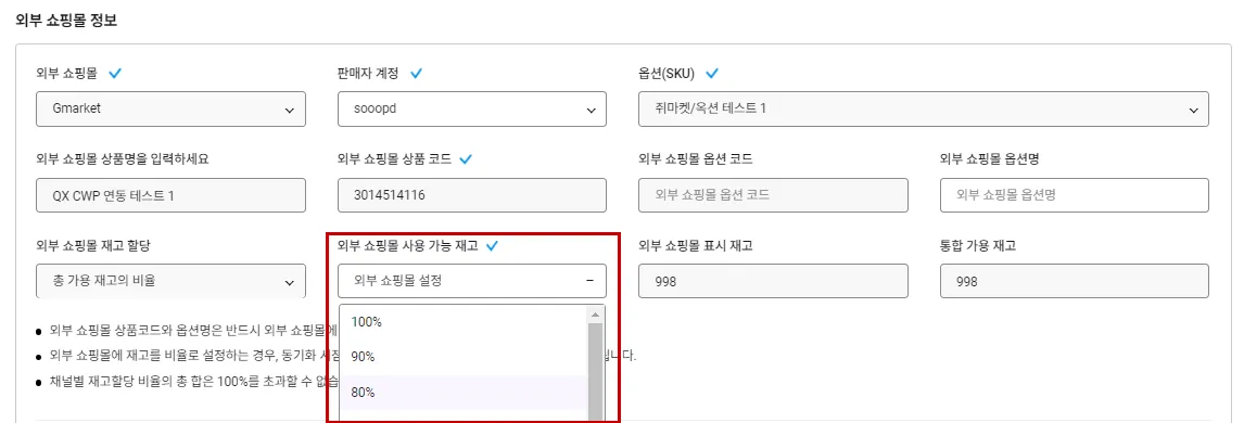 “외부 쇼핑몰 표시 재고”는 “통합 가용 재고”에 선택한 비율을 적용했을 때의 값입니다.