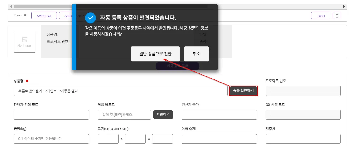 상품을 신규로 등록할 때, 상품명에 대해서 중복 확인을 실행하면 “자동 등록 상품이 발견되었습니다.”라는 팝업 메시지를 볼 수 있습니다. 이 때 [일반 상품으로 전환] 버튼을 클릭하면 사전에 수집된 정보로 상품을 전환해줍니다.