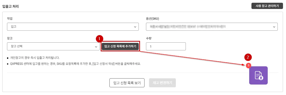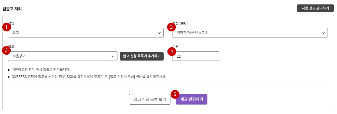 개인 창고에서 재고를 관리하는 경우, ‘입출고 처리’ 영역에서 SKU별 재고를 수정할 수 있습니다.