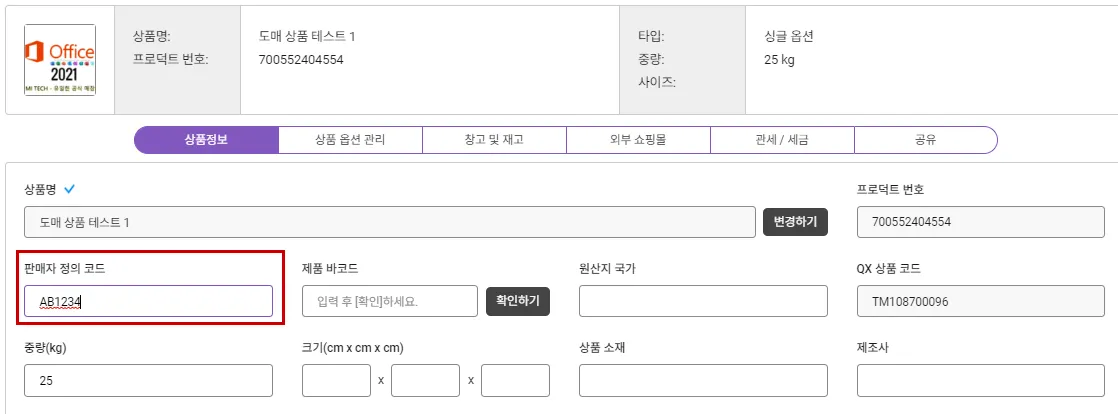 단일 상품의 경우, “상품정보” 탭에서 “판매자 정의 코드” 필드에 판매 사이트 상품과 동일한 관리코드를 입력합니다.