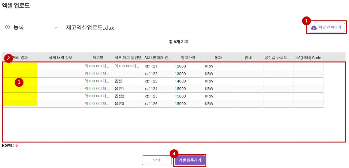 만약 필수 입력해야하는 항목이 누락되었다면 ‘처리 결과’ 영역 (노란색) 에 표시됩니다. 필수항목이 누락된 상품이 있다면, 엑셀 파일을 수정하여, 다시 [파일 선택하기] 버튼을 클릭해주세요.