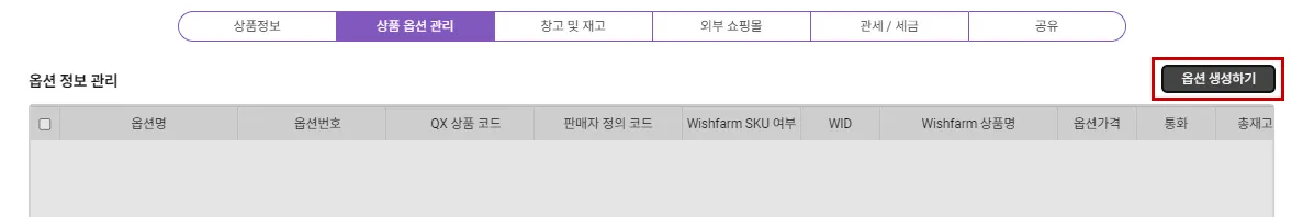“상품 옵션 관리” 탭을 선택한 후, 탭 바로 아래 우측에 있는 [옵션 생성하기] 버튼을 클릭하세요.