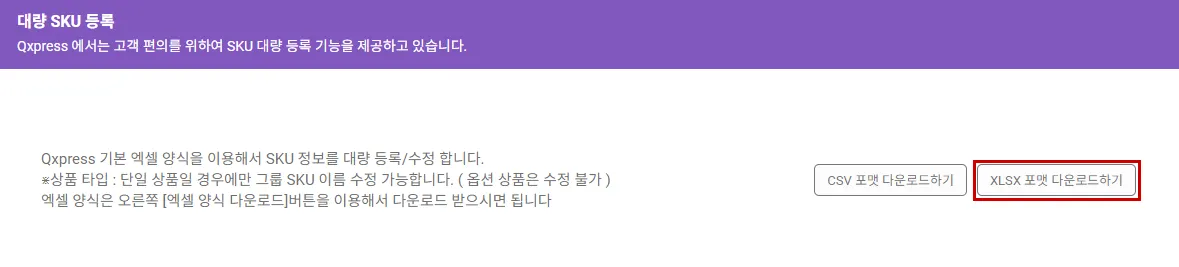 상품 정보를 기록할 서식파일은 엑셀 업로드 팝업창의 우측 상단에서 다운로드 받을 수 있습니다. [CSV 포맷 다운로드하기] 버튼과 [XLSX 포맷 다운로드하기] 버튼이 있습니다. CSV 파일은 6만개 이상의 행을 작성해야 하는 경우에만 사용하며, 일반적인 경우 [XLSX 포맷 다운로드하기] 버튼을 사용하면 됩니다.