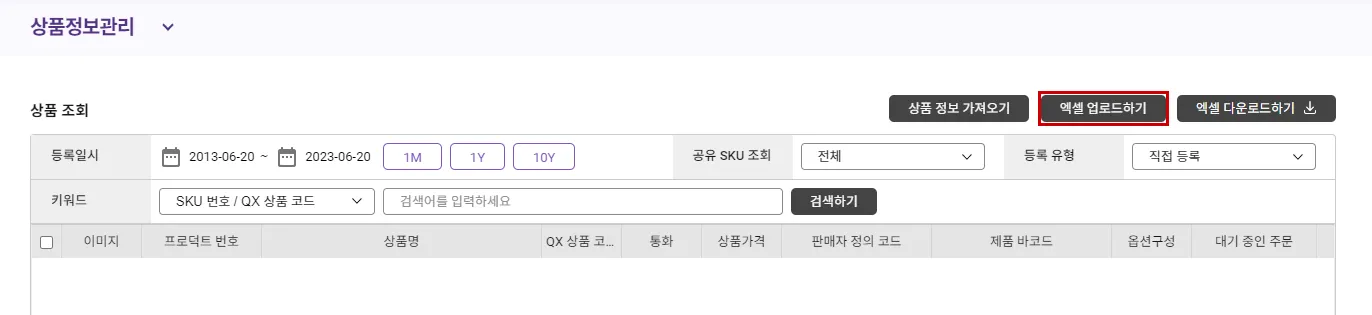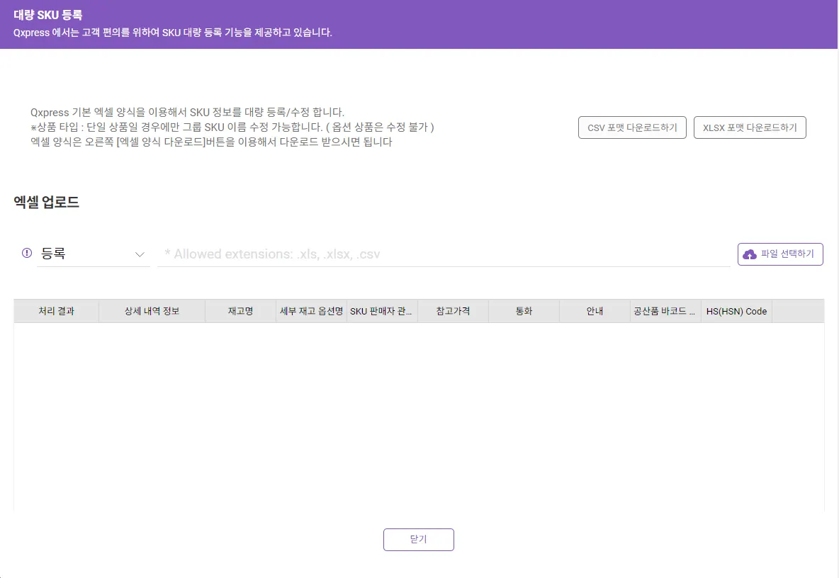 [엑셀 업로드하기] 버튼을 클릭하면 SKU등록 팝업창이 표시됩니다.