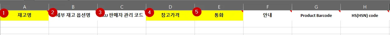 엑셀업로드시 템플릿에서 각 필드의 순서는 중요합니다. 엑셀의 각 열을 임의로 순서를 변경하면 업로드 후 올바르게 등록되지 않으니 필드의 순서를 서식 원본 그대로 유지해주세요.