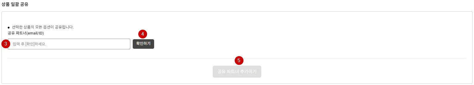 정보 일괄 편집 영역 아래에 있는 “상품 일괄 공유” 영역에서 파트너 정보를 입력하고, 공유 파트너를 추가해주세요. 파트너 등록 방법은 개별 SKU에서 파트너를 추가하는 방법과 동일합니다.
