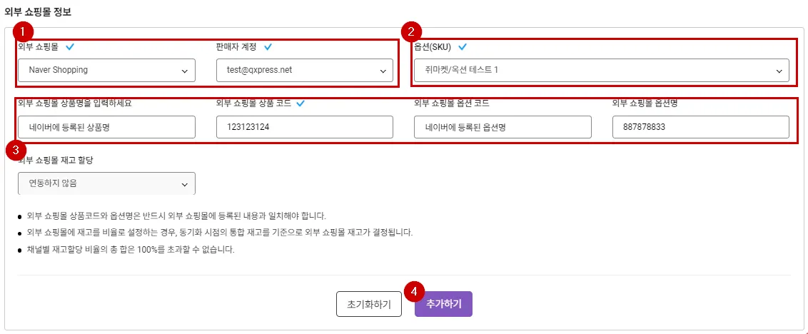외부쇼핑몰의 상품명, 상품코드, 옵션명, 옵션코드를 입력합니다. (외부 쇼핑몰에서 단일 상품으로 등록되어 있으면 옵션코드와 옵션명은 생략할 수 있습니다.)