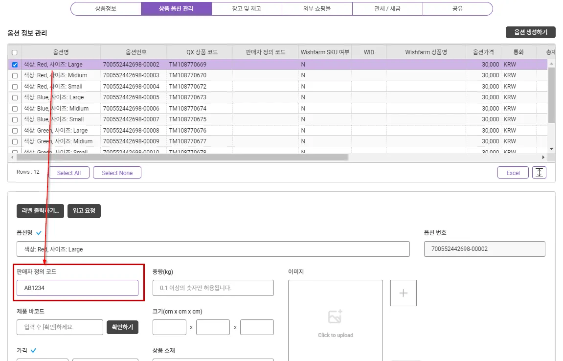 옵션 상품의 경우, “상품 옵션 관리” 탭에서 옵션을 선택한, 해당 옵션의 “판매자 정의 코드”에 판매사이트 상품과 동일한 관리코드를 입력합니다.