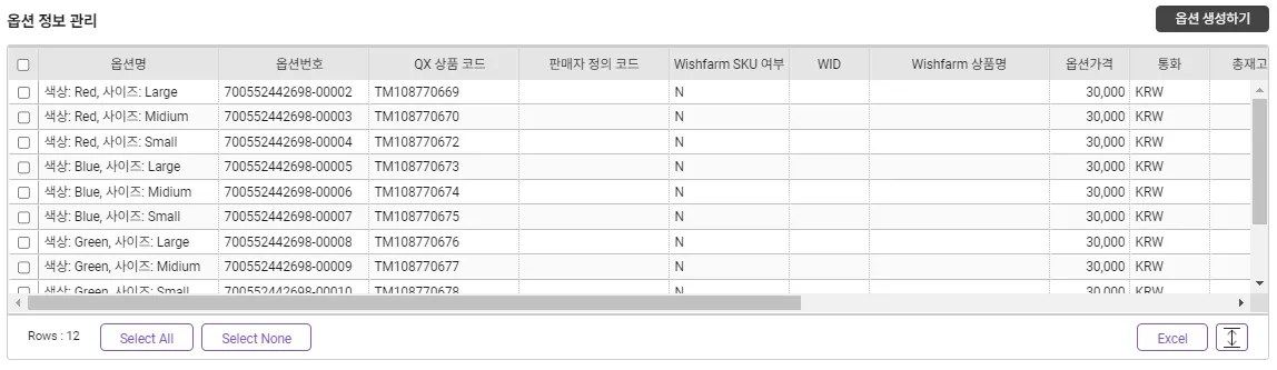 옵션생성기가 옵션을 등록한 후에는 옵션 목록이 자동으로 새로 고침되어 등록된 옵션이 표시됩니다. 옵션 가격 정보는 상품 정보에 등록된 가격이 기본값으로 들어가며, 필요한 경우 옵션 관리 화면에서 수정할 수 있습니다.