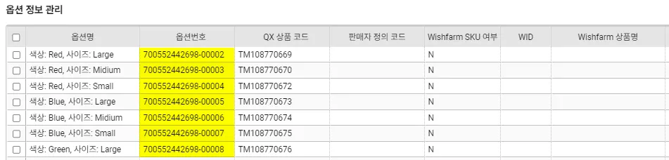 옵션번호는 상품번호(프로덕트 번호) 뒤에 -00002, -00003,… 과 같은 순번으로 구성됩니다. 만약 싱글상품인 경우에는 -00001을 뒤에 붙이면 됩니다.