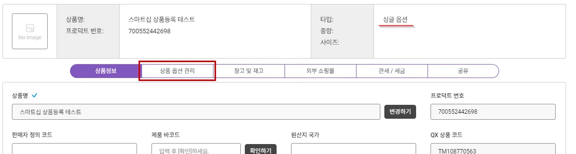 따라서, 싱글상품에 옵션을 추가하는 시점에 상품에 등록된 판매자 정의코드값은 삭제됩니다. 멀티 옵션 상품의 경우 각각의 옵션에 있는 판매자 정의코드 필드를 사용해주세요.