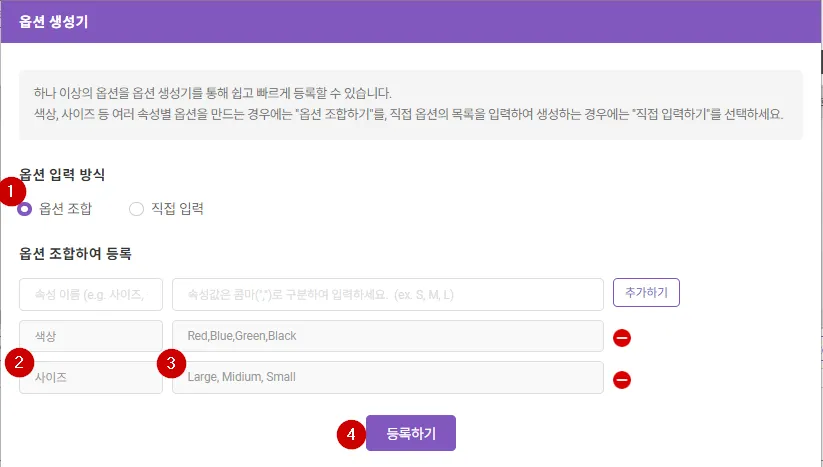 [등록하기] 버튼을 클릭해주세요. 입력된 정보를 조합하여 모든 옵션이 한 번에 등록됩니다.