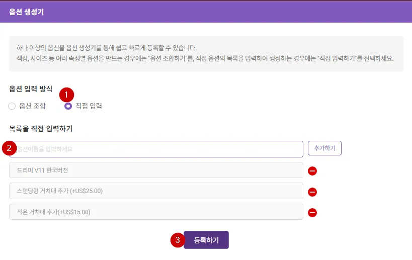 ‘옵션 입력 방식’에서 “직접 입력”을 선택합니다.