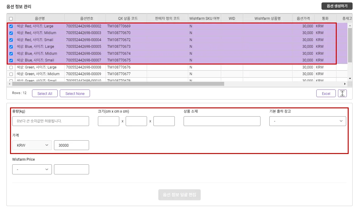 상품정보 및 옵션정보 관리 화면 하단에 표시되는 WISFARM Price는 Qoo10(qoo10.jp 제외)의 Wishfarm 서비스를 통해 판매되는 상품의 원가 관리를 위해 등록하는 영역이며, 해당 캠페인에 참가하지 않는 판매자는 사용하지 않는 정보입니다.