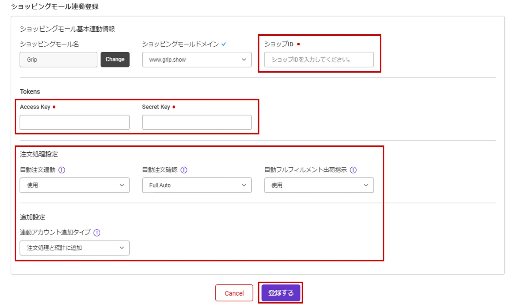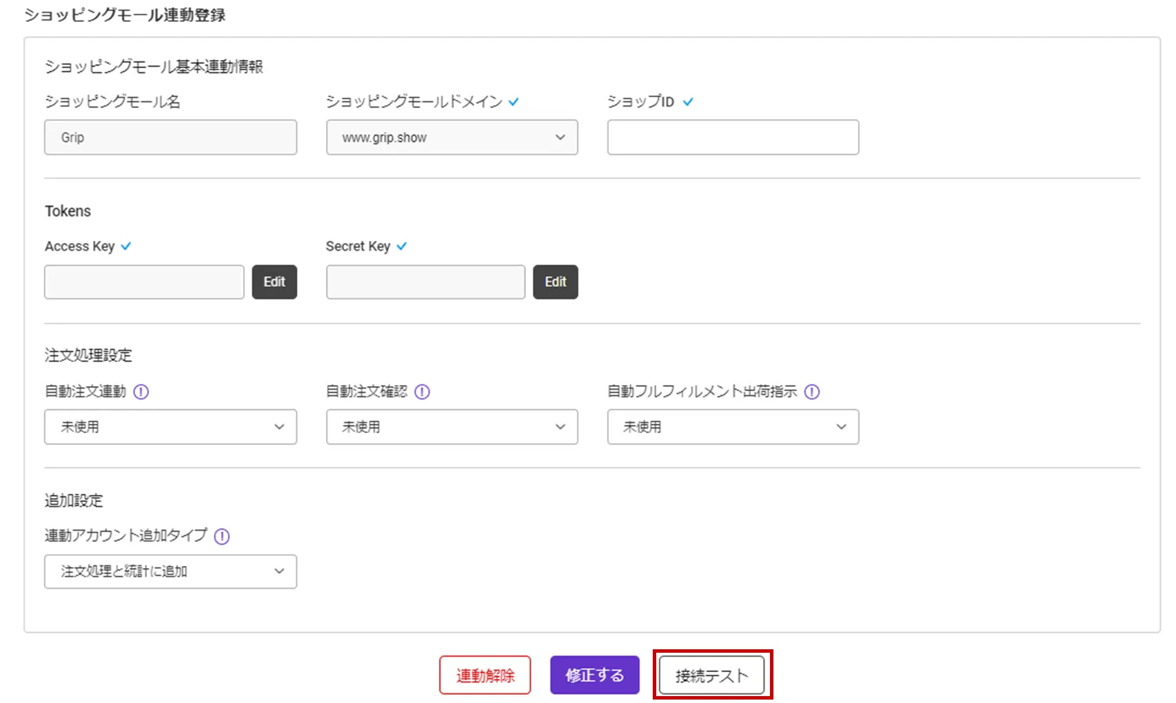 Access Key : 1. Grip ビジネスセンターでAPI KEYの発行を受ける の手順で発行された Access Key を入力します。