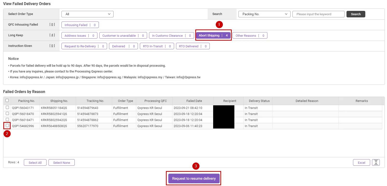 Clicking the [Request to resume delivery] button will cancel the abort shipping