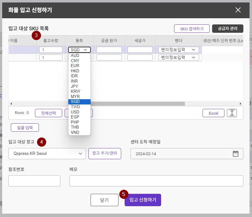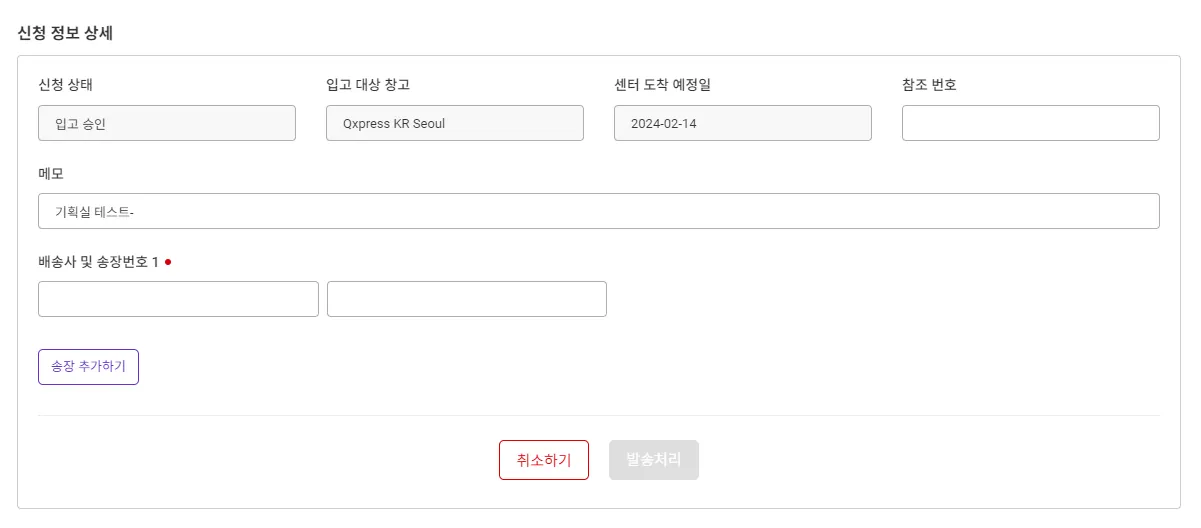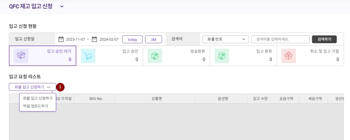 경로 : 상품 및 재고 > 입고 신청(QFC 재고 입고 신청)