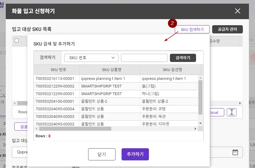 이어서 나오는 창에서 입고 하실 대상 SKU를 더블클릭 또는 [추가하기] 버튼을 눌러 추가합니다.