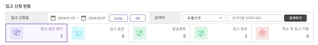 입고가 완료되면 ‘입고 승인 대기’ 상태의 신청서가 생성됩니다.