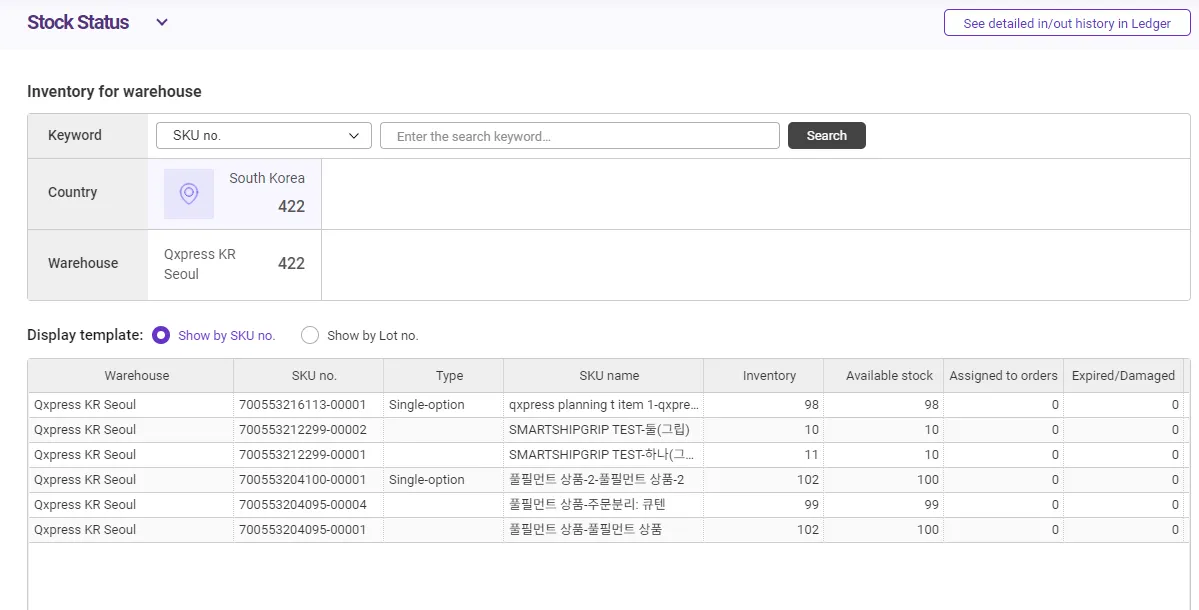 창고에 입고된 SKU 재고에 대해서 국가별, QFC 센터 별 재고 파악을 할 수 있습니다.